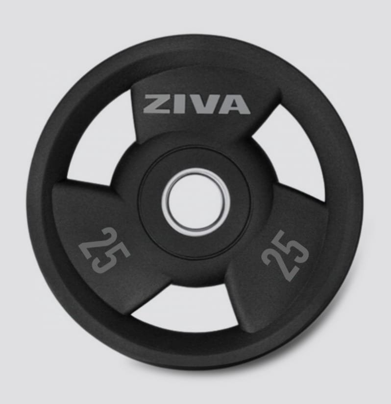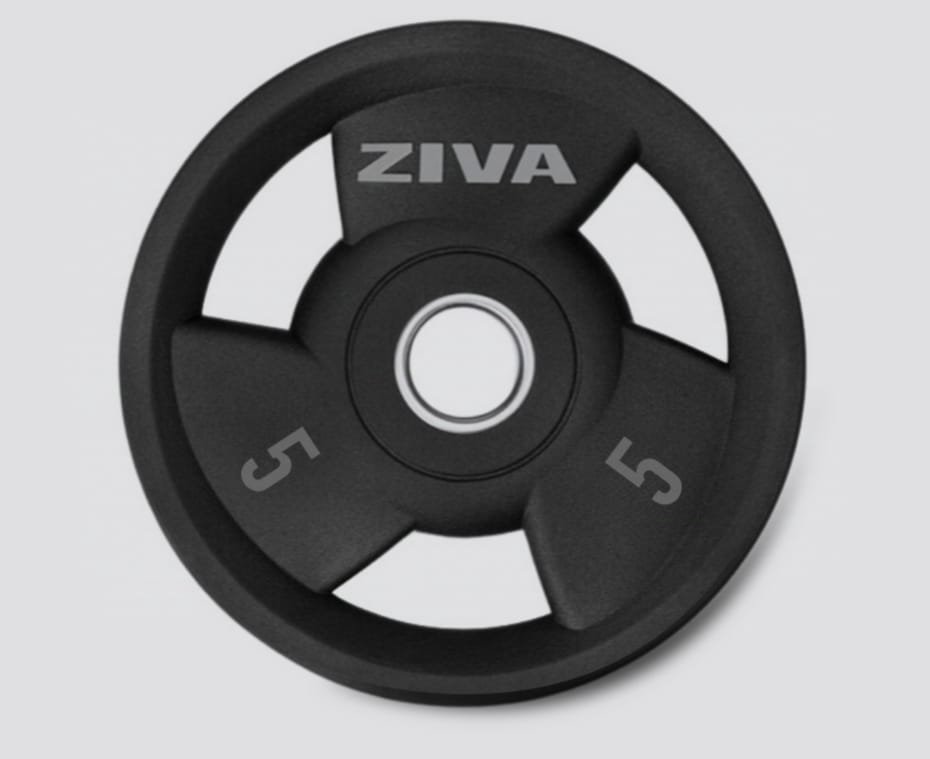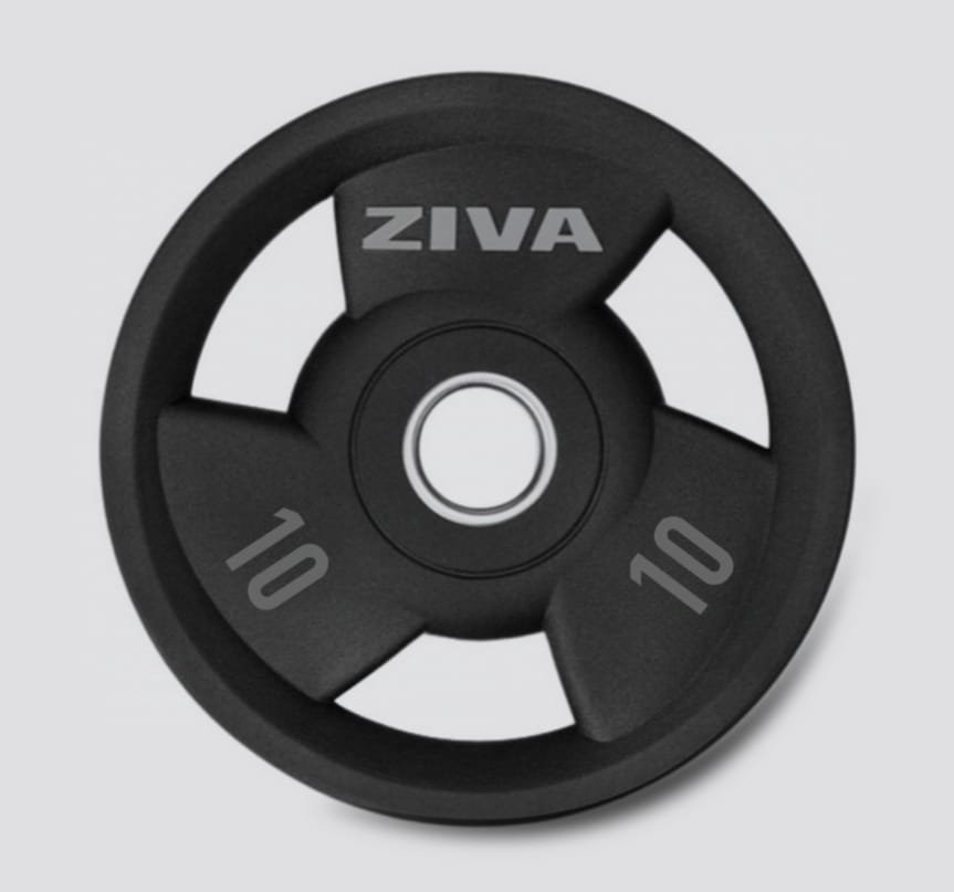 El disco de agarre de uretano ZIVA, fabricado para adaptarse a cualquier barra olímpica estándar, es un disco de élite premium fundido con precisión que presenta un diseño elegante y llamativo para sus mangos y su cara, fácil numeración de identificación, bordes biselados y tres mangos para recogerlo fácilmente desde cualquier ángulo.